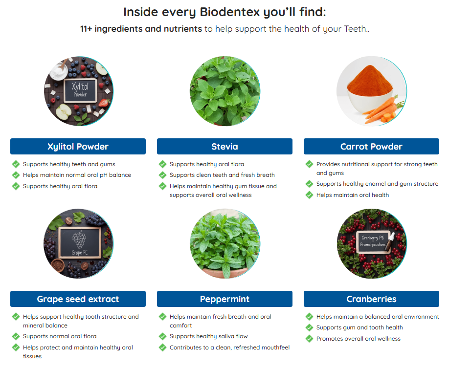 Instead, BioDentex is legit because it relies on clinically studied mechanisms. Ingredients like Xylitol and Grape Seed Extract have decades of peer-reviewed research supporting their ability to interfere with plaque and support tissue resilience. Trust signals include: